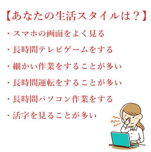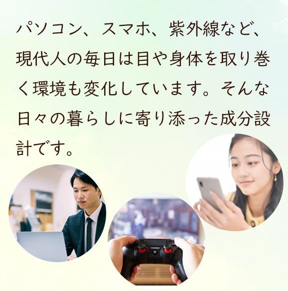 パソコン、スマホ、紫外線など、現代人の毎日は目や身体を取り巻く環境も変化しています。そんな日々の暮らしに寄り添った成分設計です。