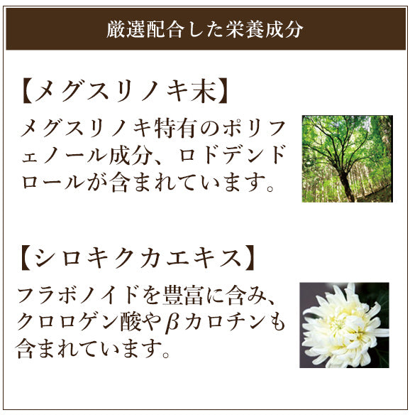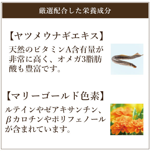 | 原材料名 | クコの実エキス(中国)、真珠貝末、ジオウ(葉)末、サンシチニンジン末、エビスグサエキス、デキストリン、シロキクカエキス、ハチミツ末、サメ軟骨抽出物、アワビ貝殻末、オオバコエキス、トマト末(リコピン含有)、ハルコガネバナエキス、ミカン果皮エキス、メグスリノキ末、ビルベリーエキス、鯉の胆末、ヤツメウナギエキス、ムラサキナツフジ末、マムシの胆末、タンジン(葉)エキス/ショ糖脂肪酸エステル、ヘマトコッカス藻色素(アスタキサンチン含有)、マリーゴールド色素、精製セラック(一部にゼラチンを含む) |