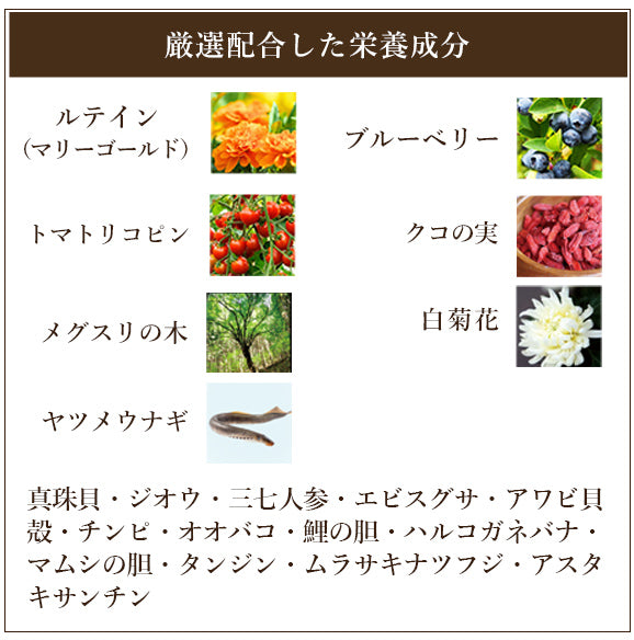 原材料名 | クコの実エキス(中国)、真珠貝末、ジオウ(葉)末、サンシチニンジン末、エビスグサエキス、デキストリン、シロキクカエキス、ハチミツ末、サメ軟骨抽出物、アワビ貝殻末、オオバコエキス、トマト末(リコピン含有)、ハルコガネバナエキス、ミカン果皮エキス、メグスリノキ末、ビルベリーエキス、鯉の胆末、ヤツメウナギエキス、ムラサキナツフジ末、マムシの胆末、タンジン(葉)エキス/ショ糖脂肪酸エステル、ヘマトコッカス藻色素(アスタキサンチン含有)、マリーゴールド色素、精製セラック(一部にゼラチンを含む) |